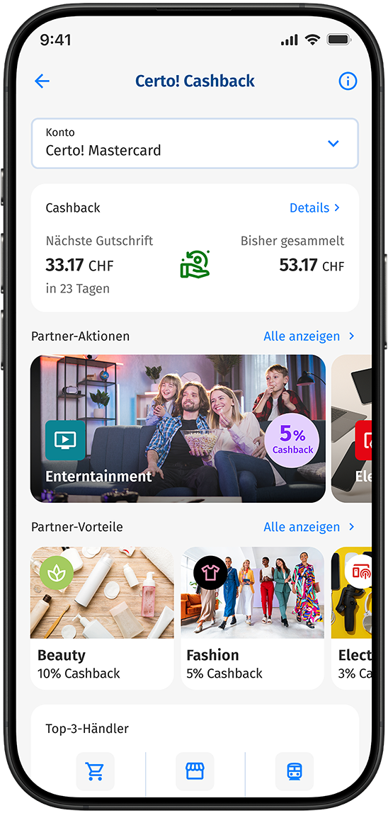 Jedes Mal, wenn Sie mit Certo! bezahlen, sammeln Sie Cashback1. Weltweit und überall. Einmal pro Quartal wird der Cashback-Betrag von Ihrer Kreditkartenrechnung abgezogen. Sie müssen sich um nichts kümmern und profitieren automatisch. Ganz einfach eben.