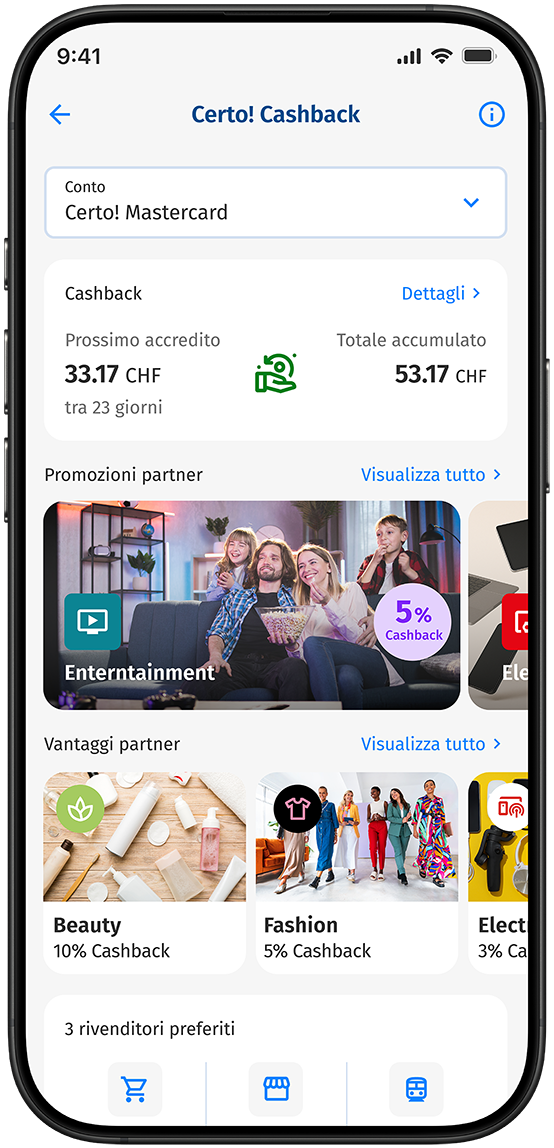 Ogni volta che paga con Certo!, accumula cashback1. Ovunque e in tutto il mondo. Una volta ogni trimestre, i risparmi vengono automaticamente detratti dalla sua fattura. Non deve fare nulla e beneficia automaticamente. È davvero semplicissimo.